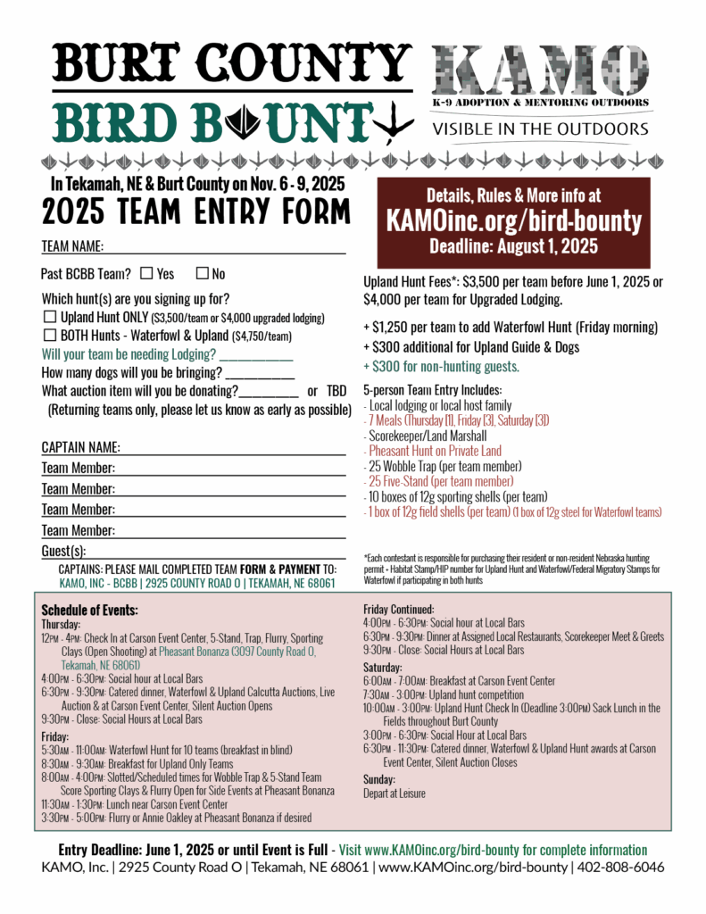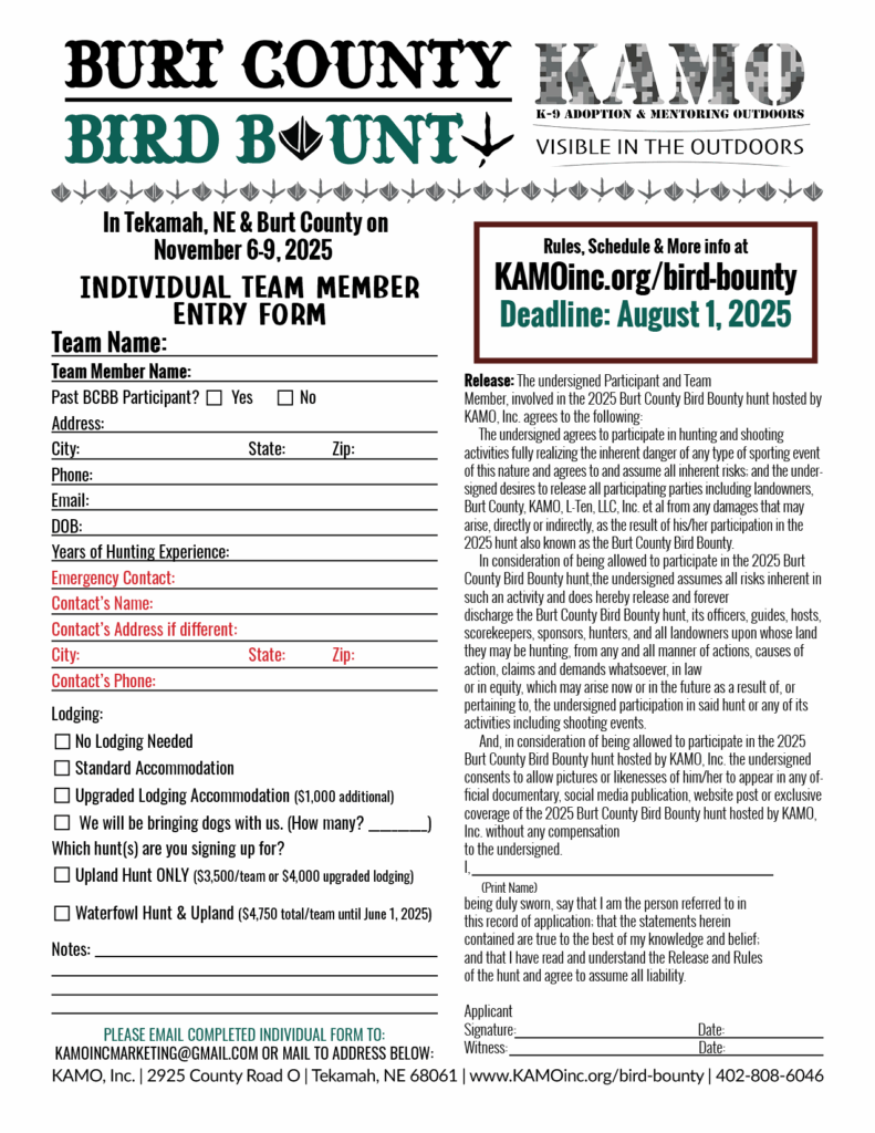 2925 COUNTY ROAD O, TEKAMAH, NE 6806. Registration is also available online at www.KAMOinc.org/bird-bounty